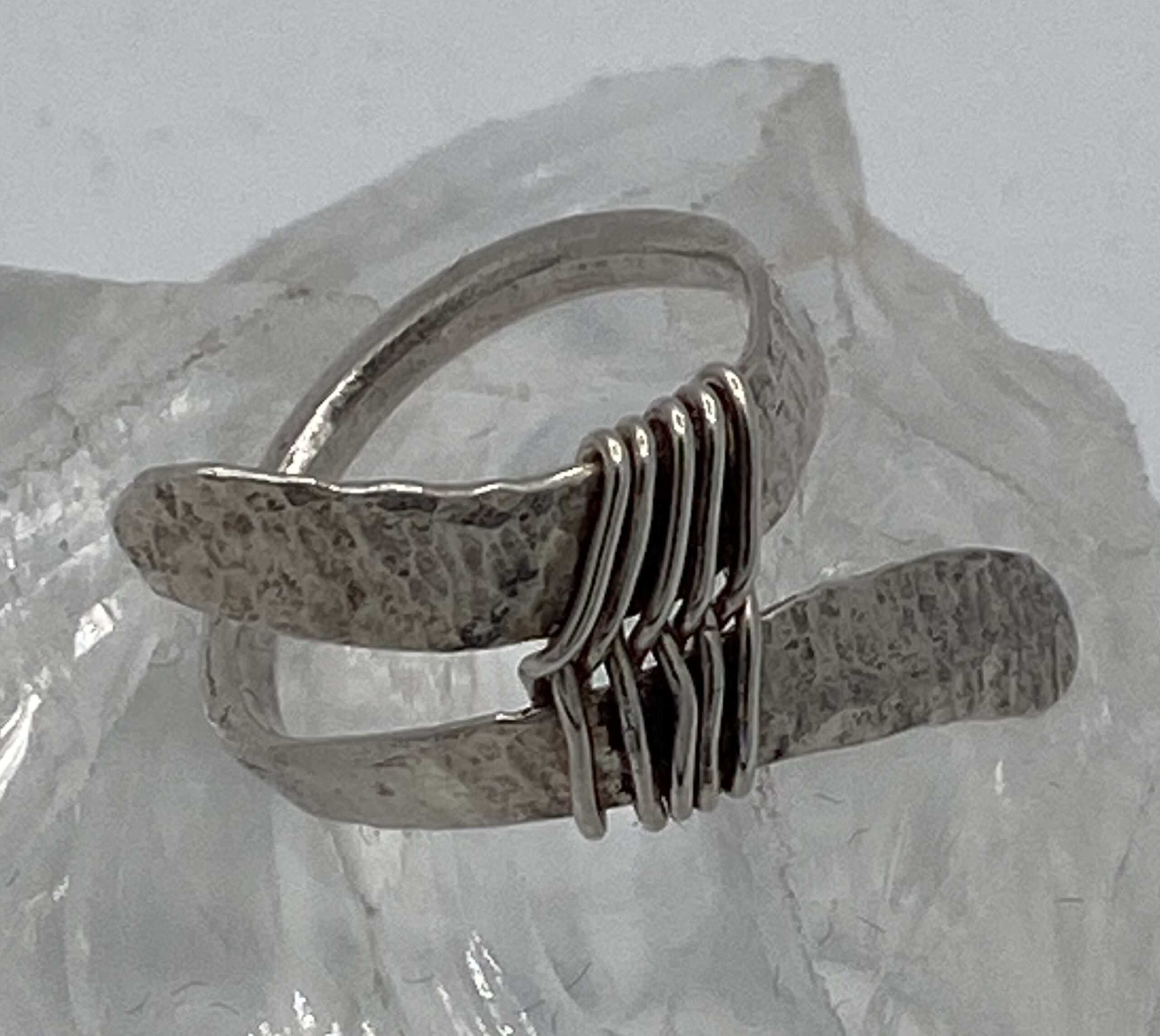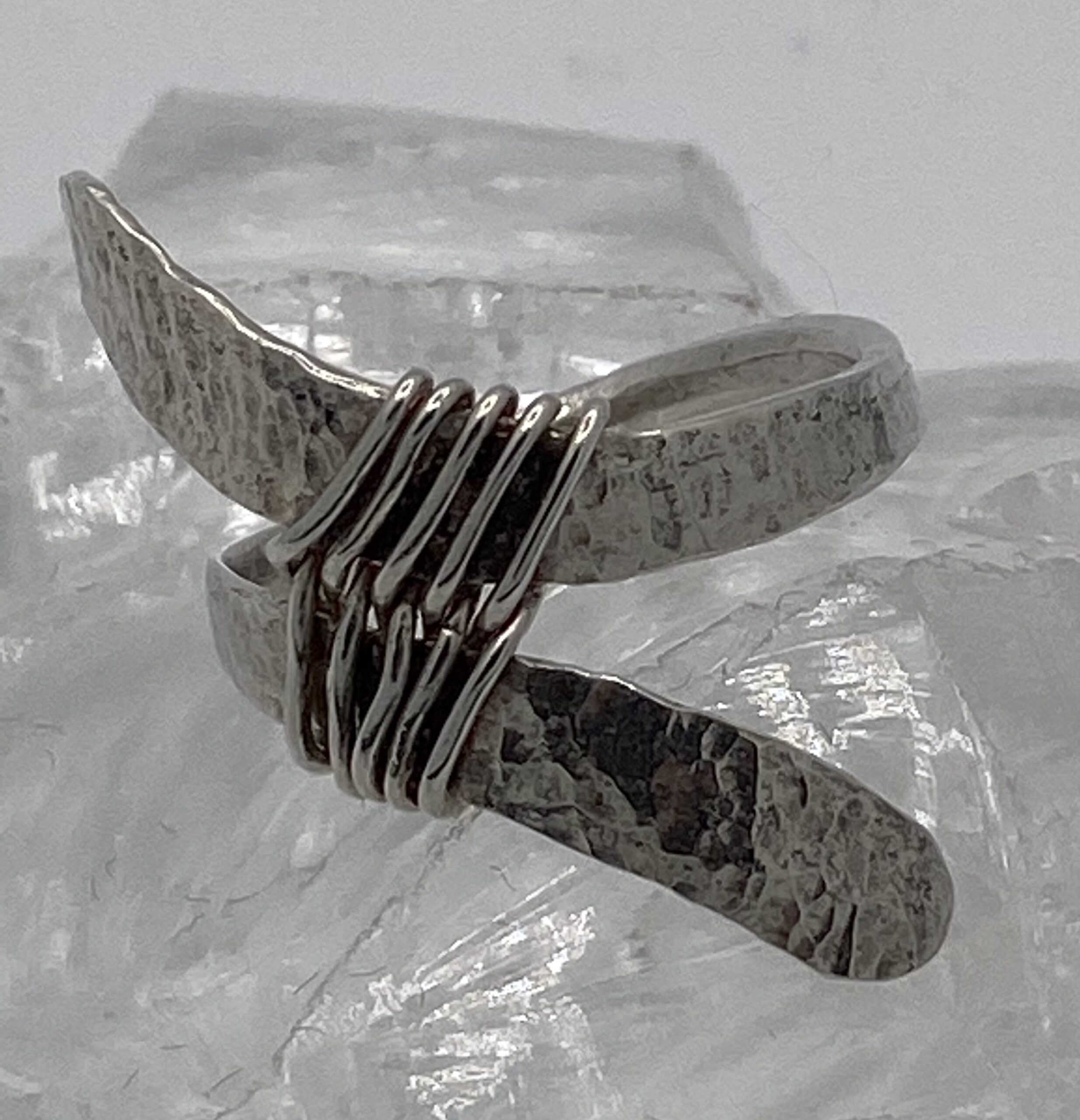/ gesmeden en gehamerde ring met zilverdraad