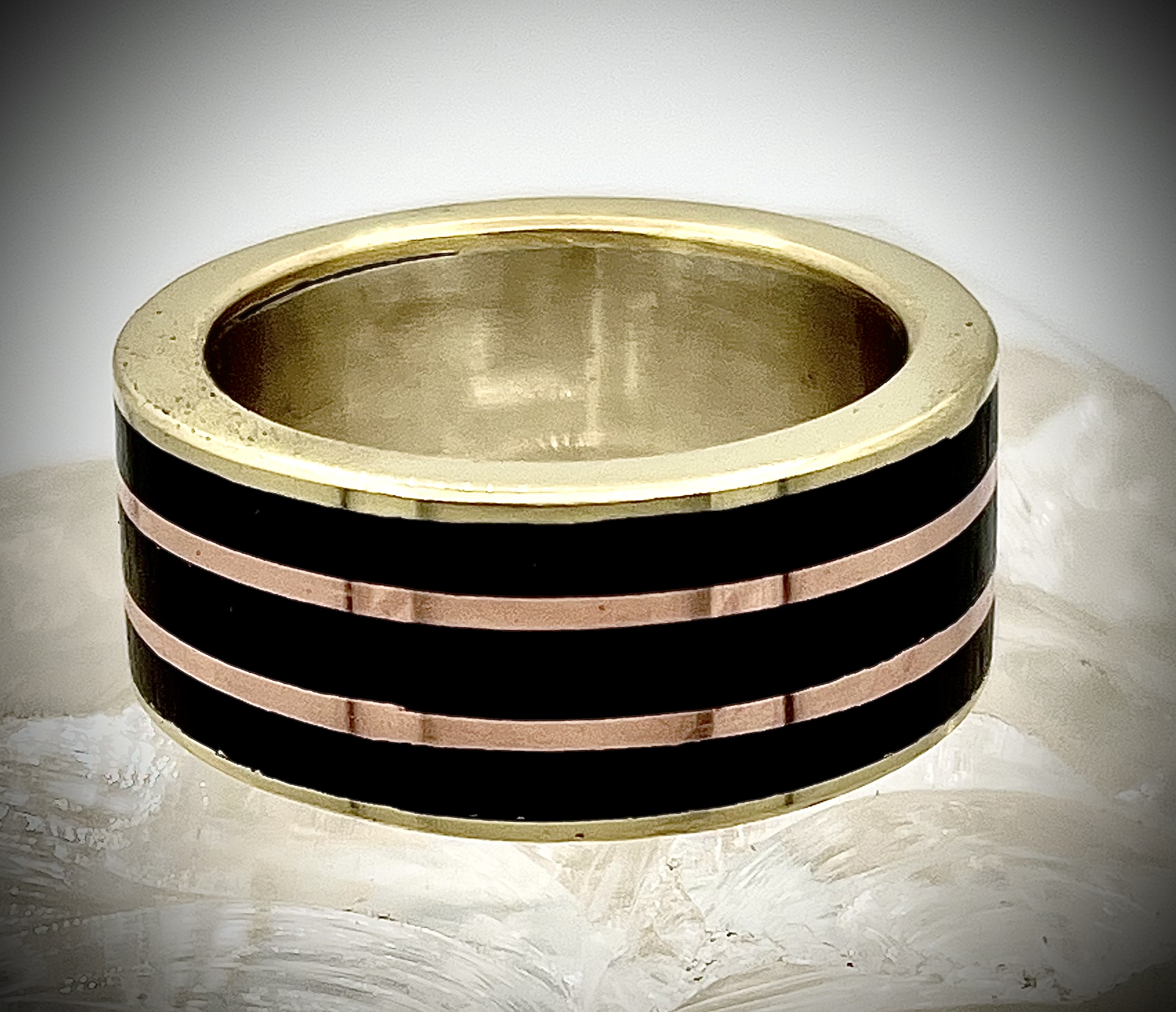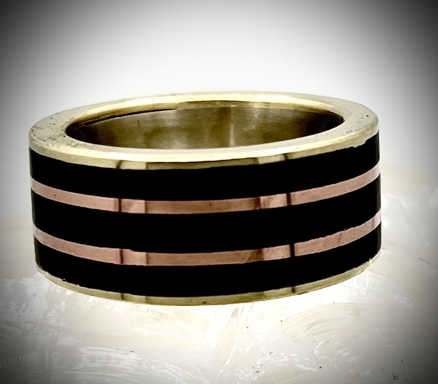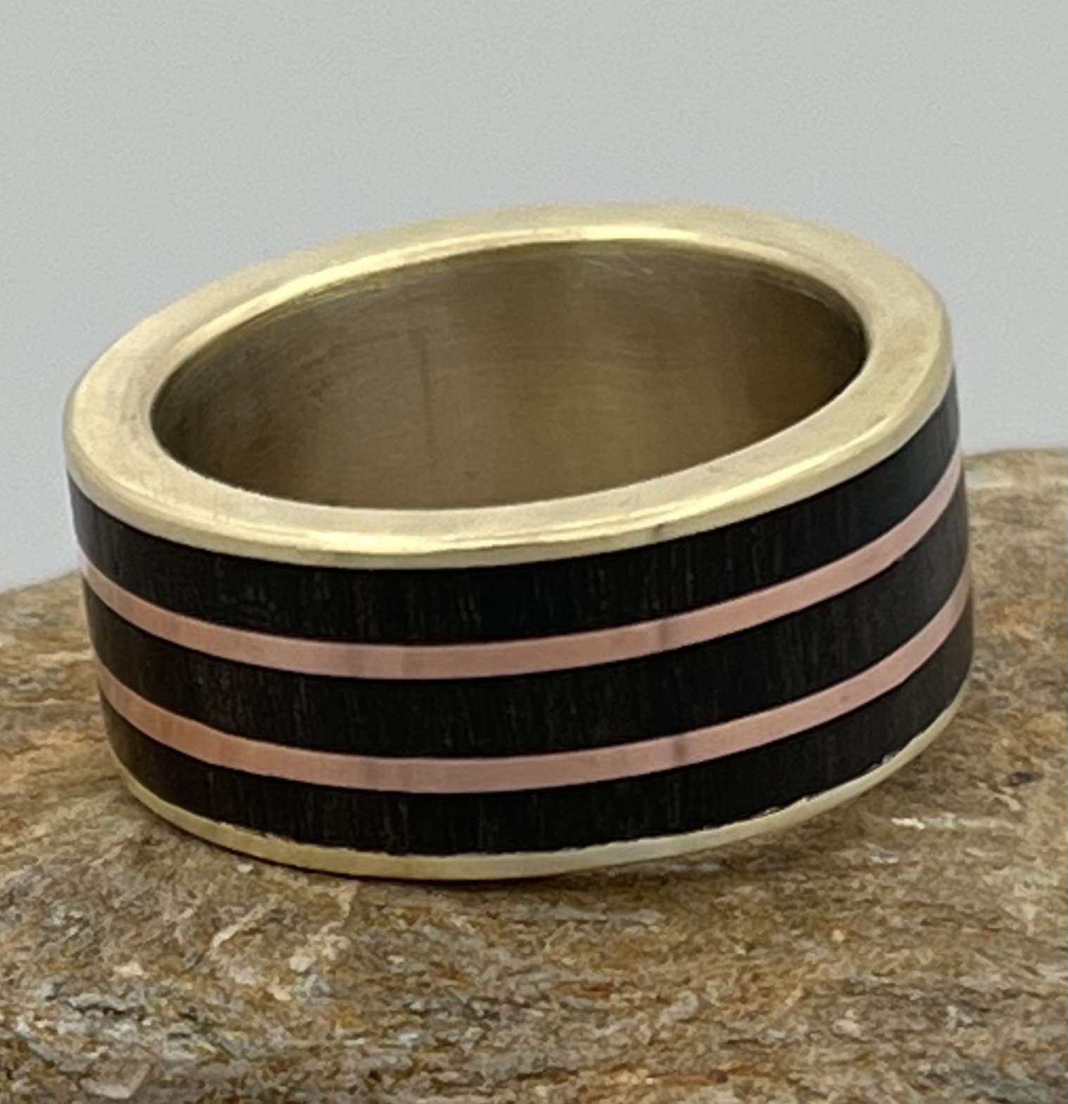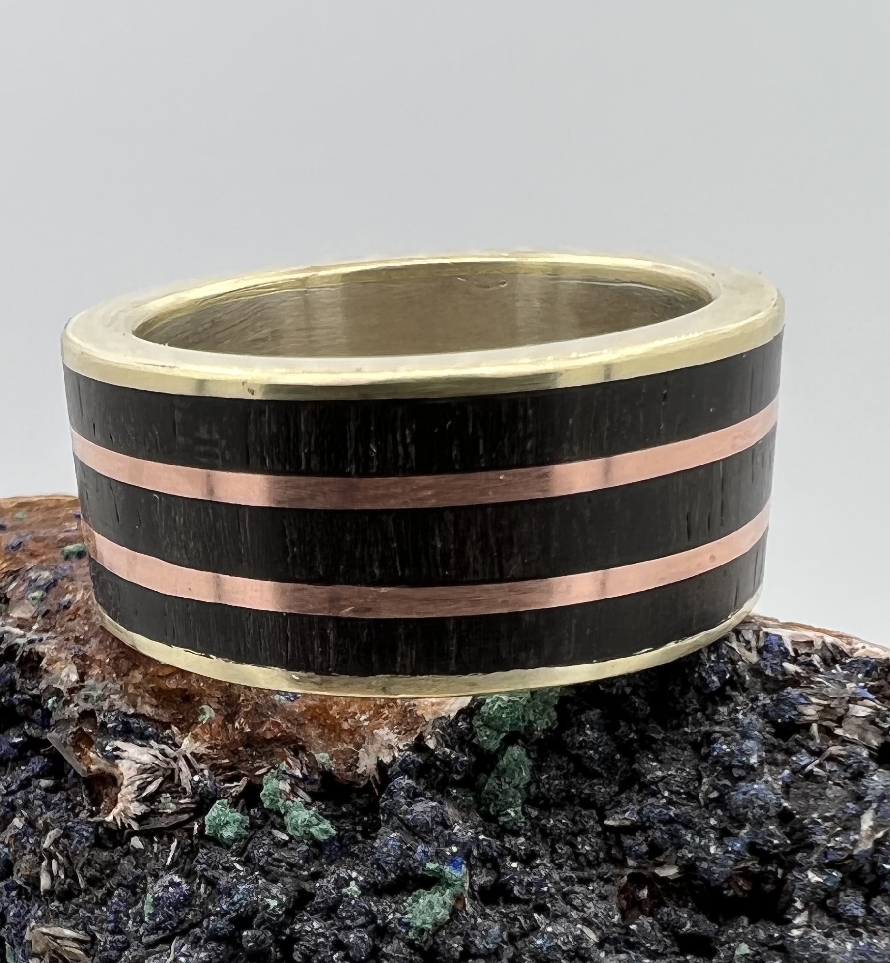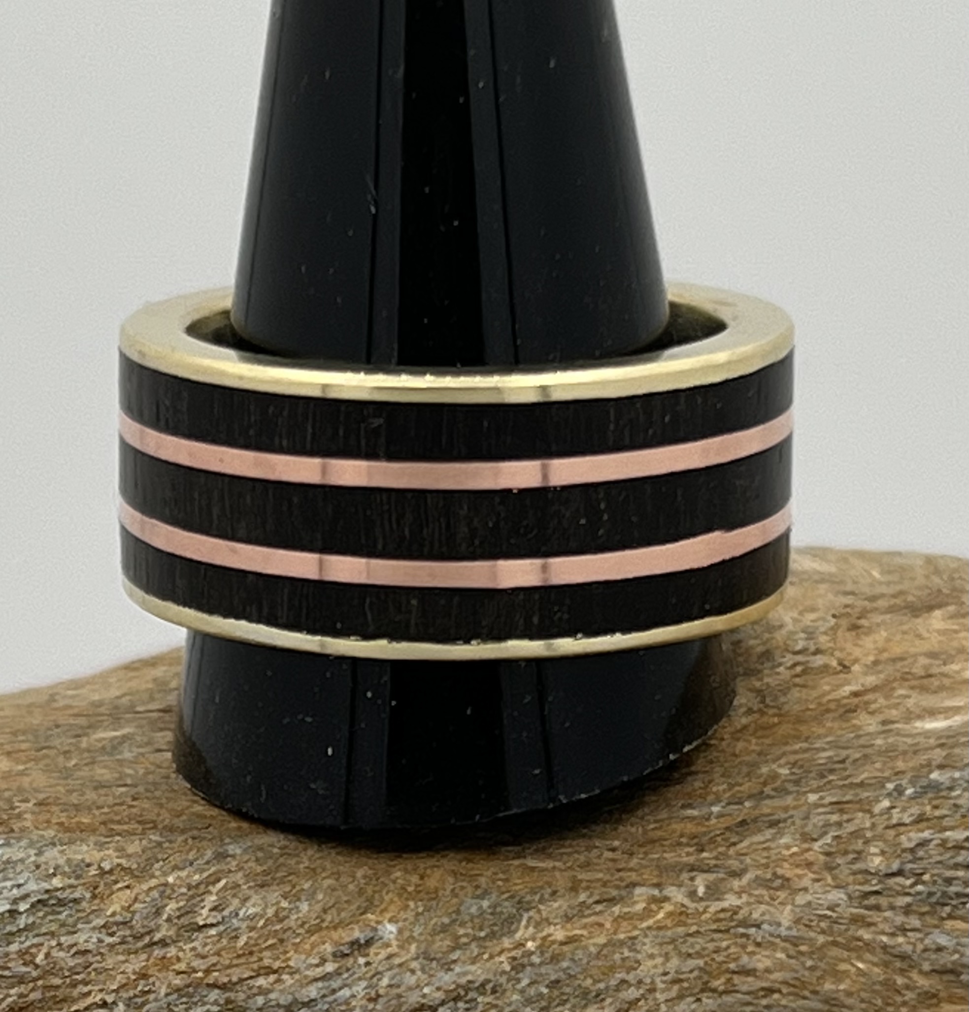 / Stoere heren/damesring ebbenhout, messing ,koper