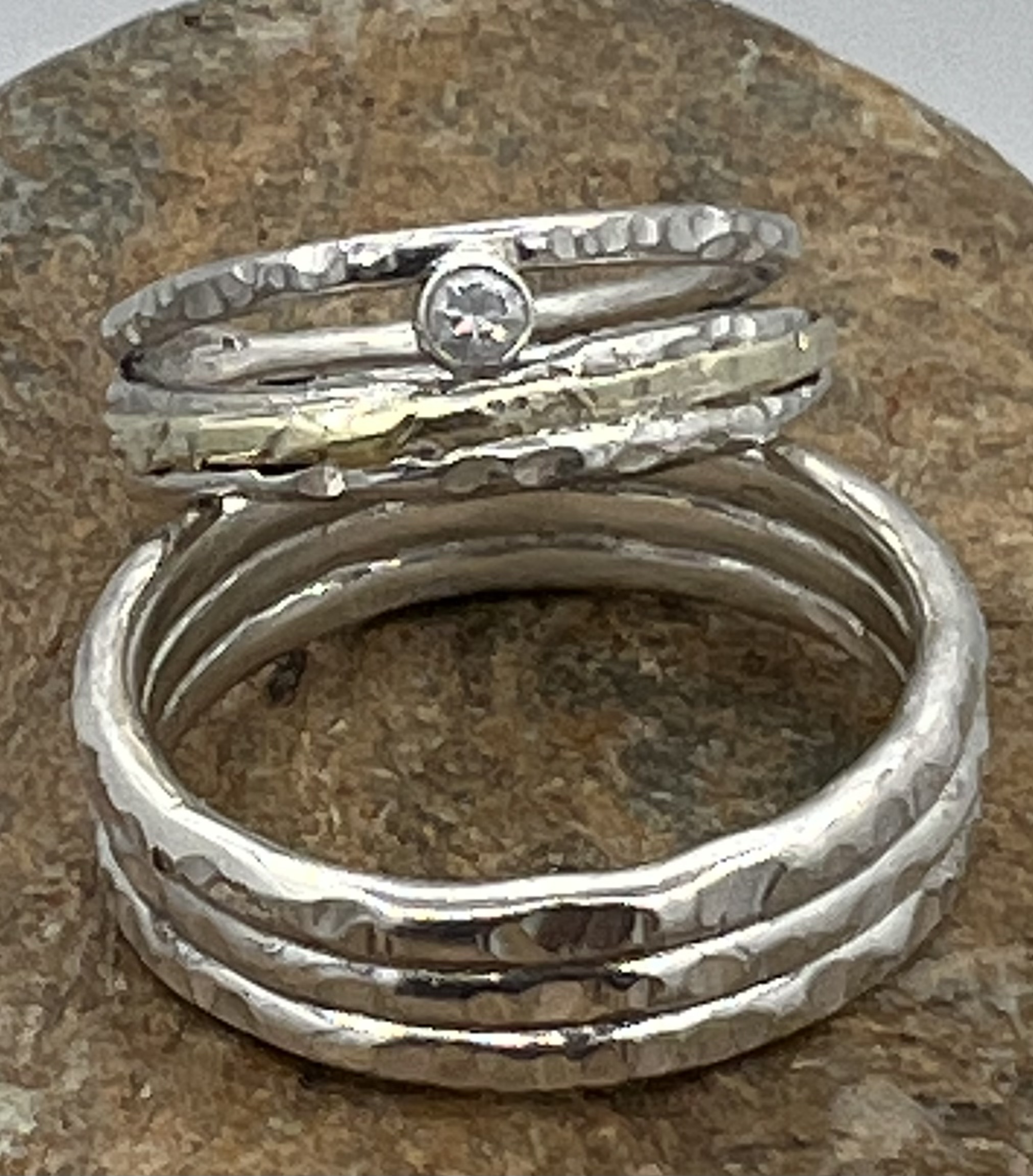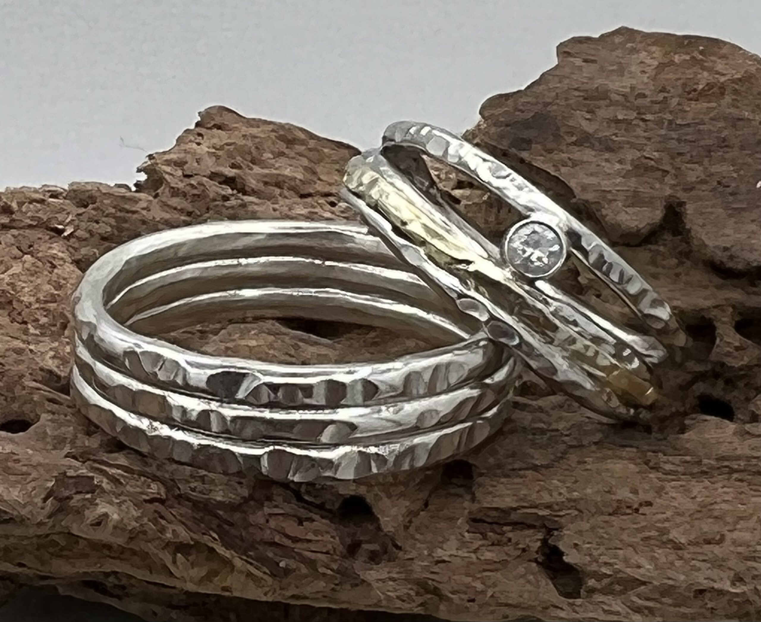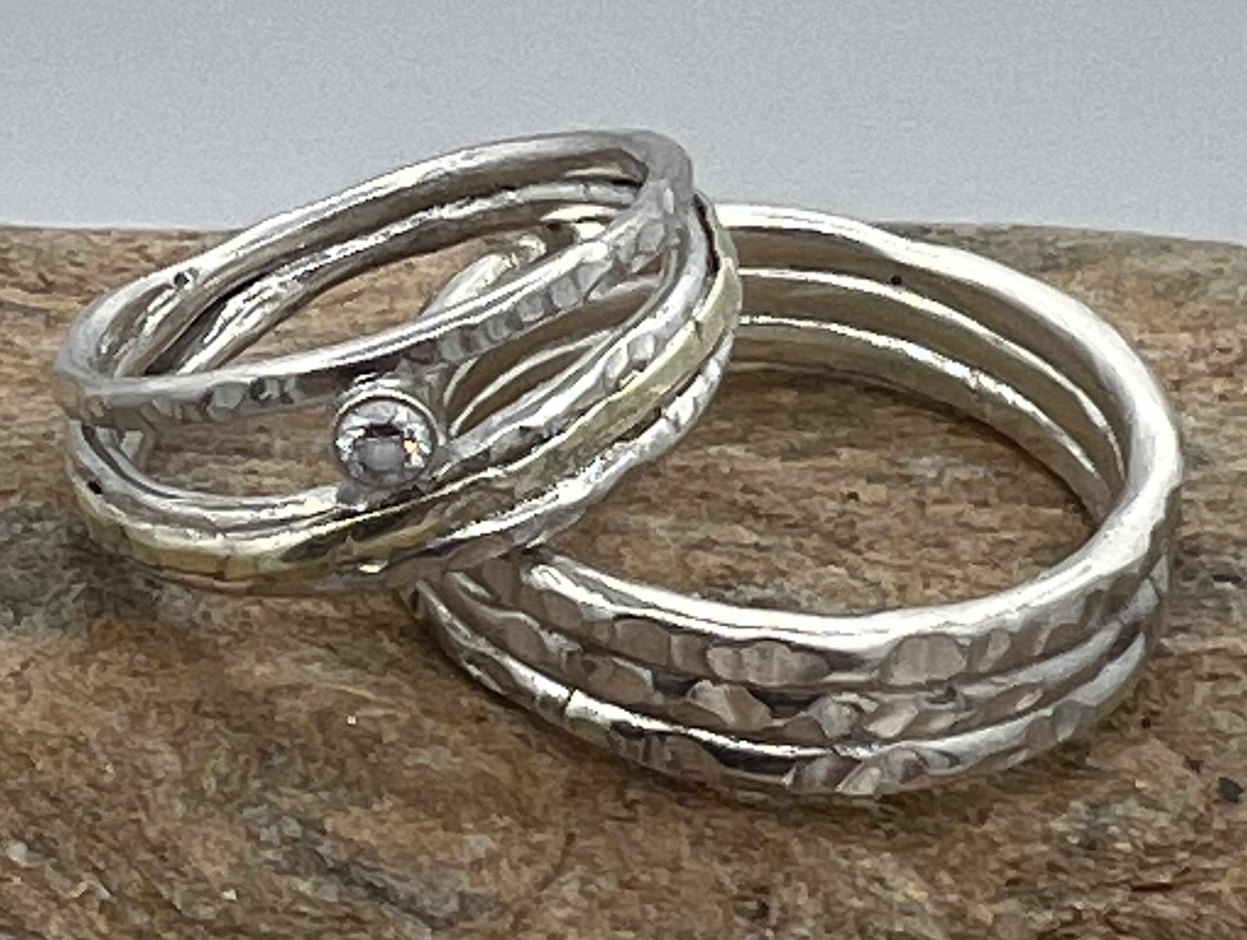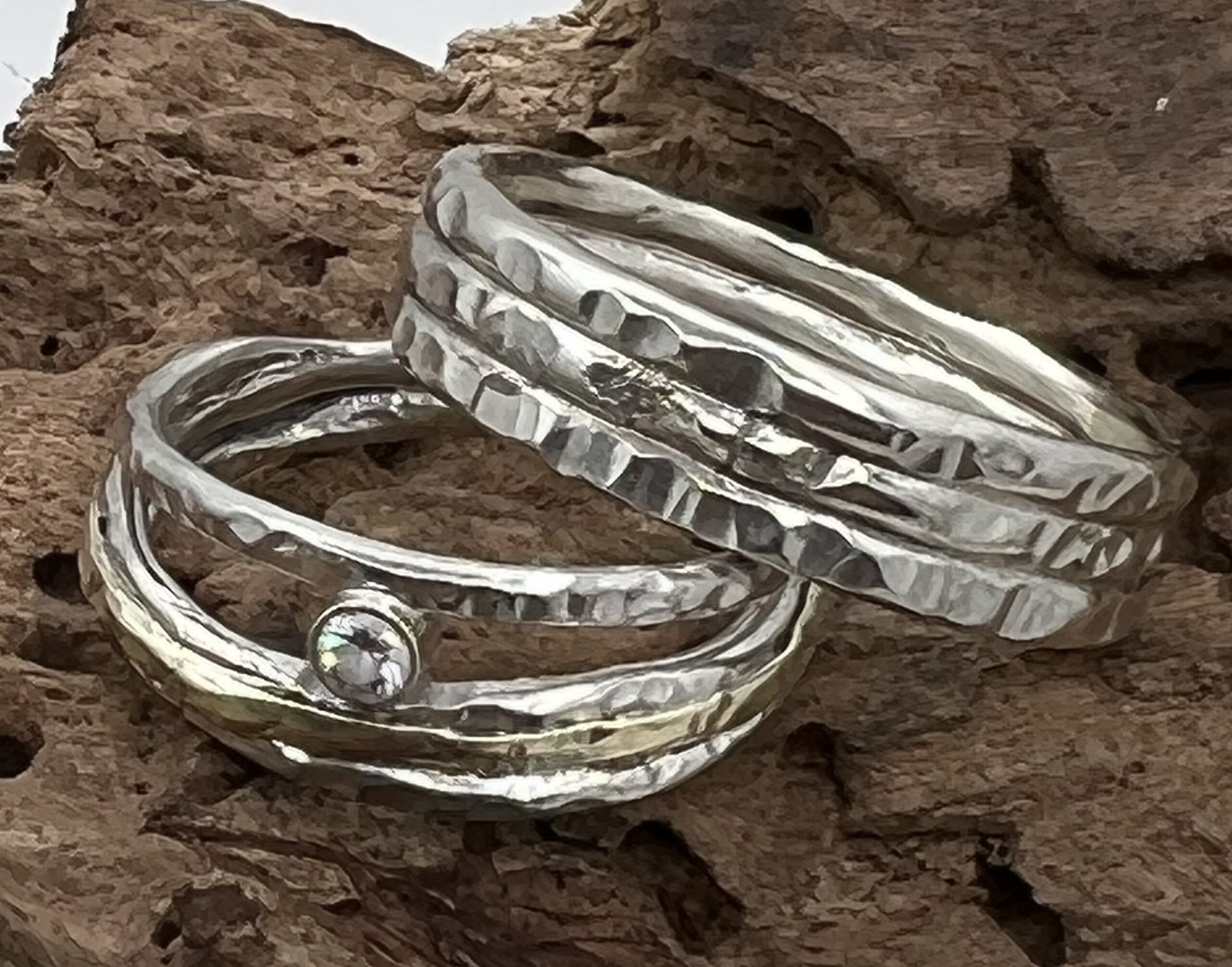 / Trouwringen setje zilver 925 gehamerd en ingelegd met xirkoon