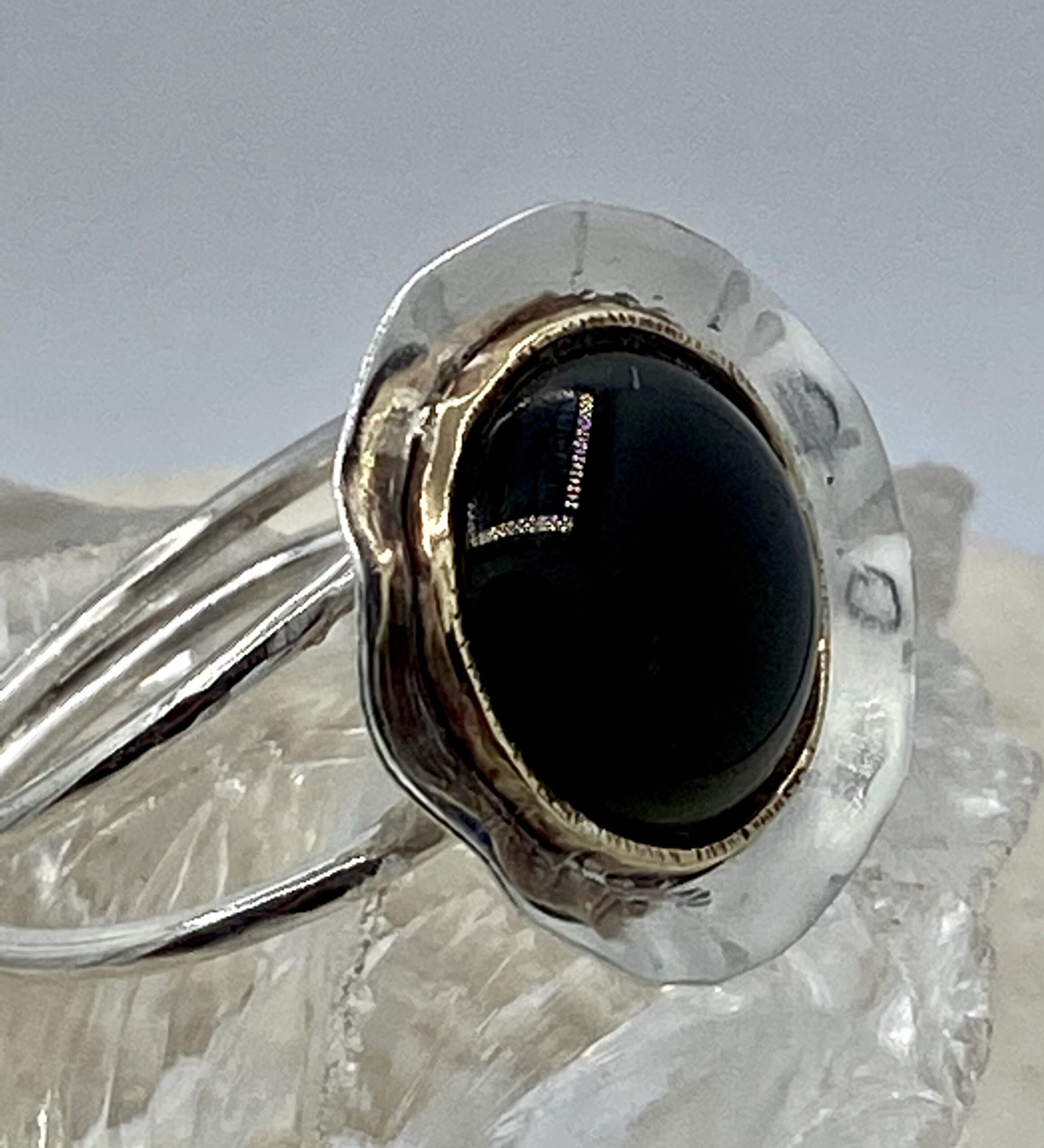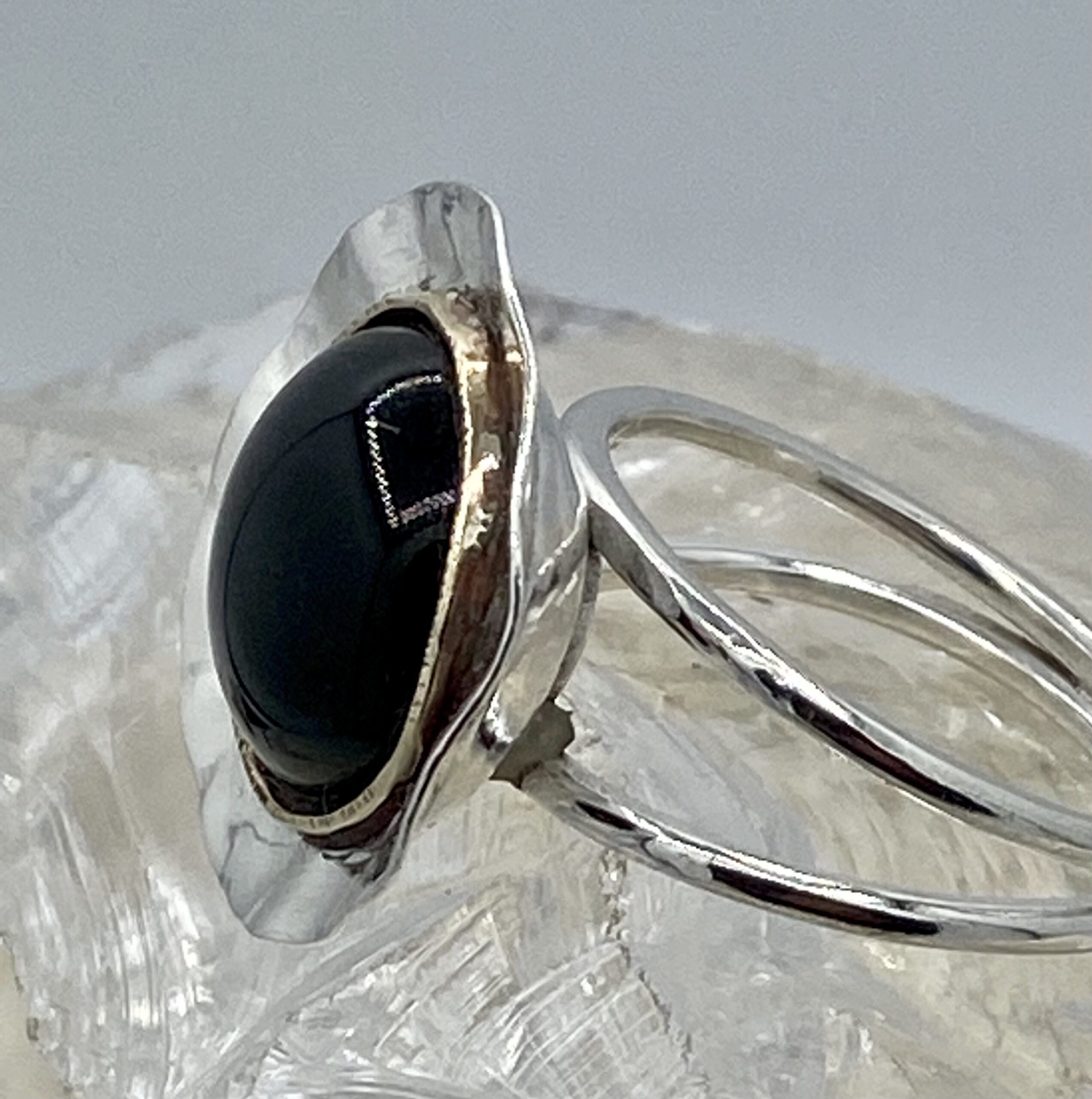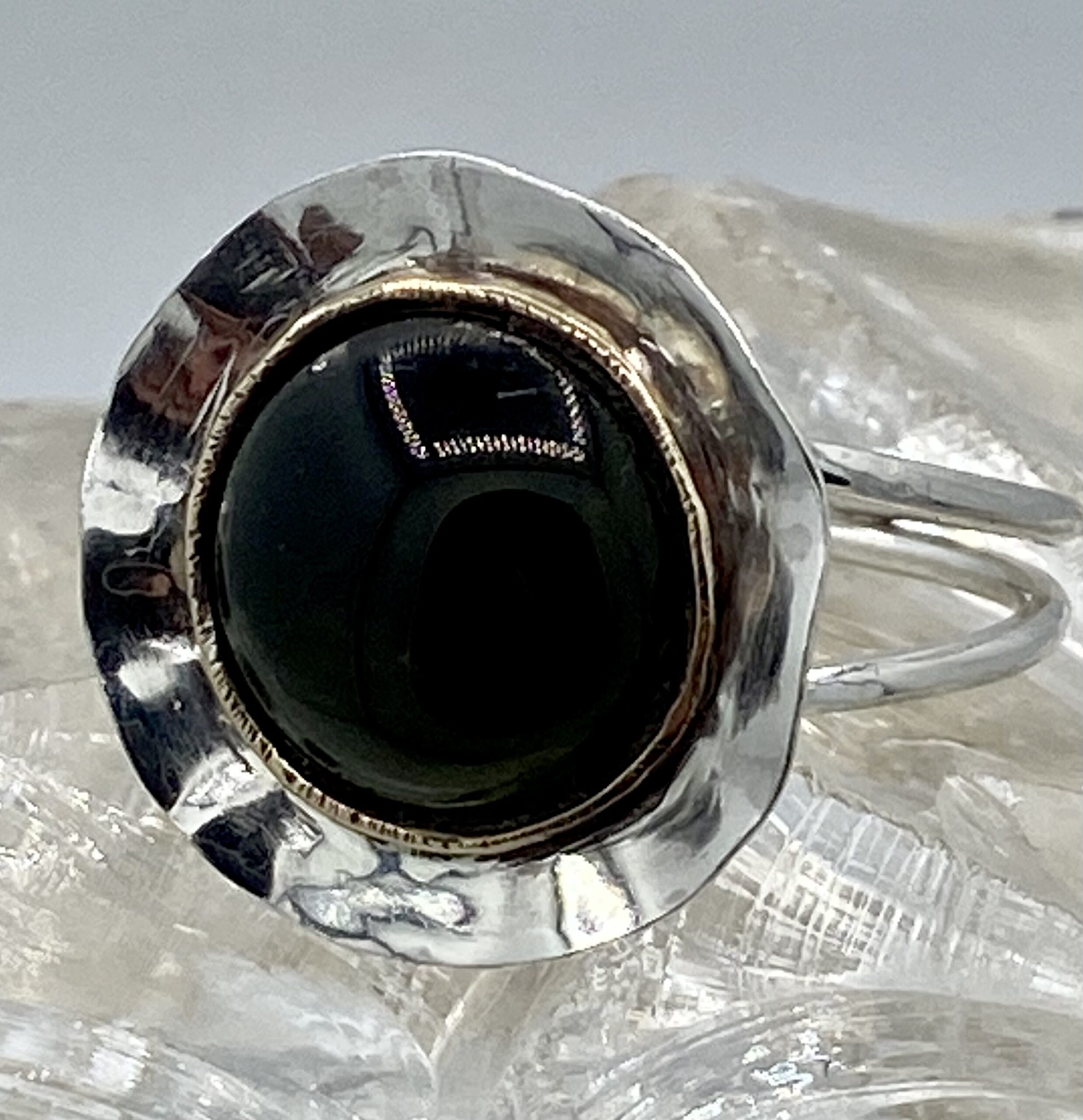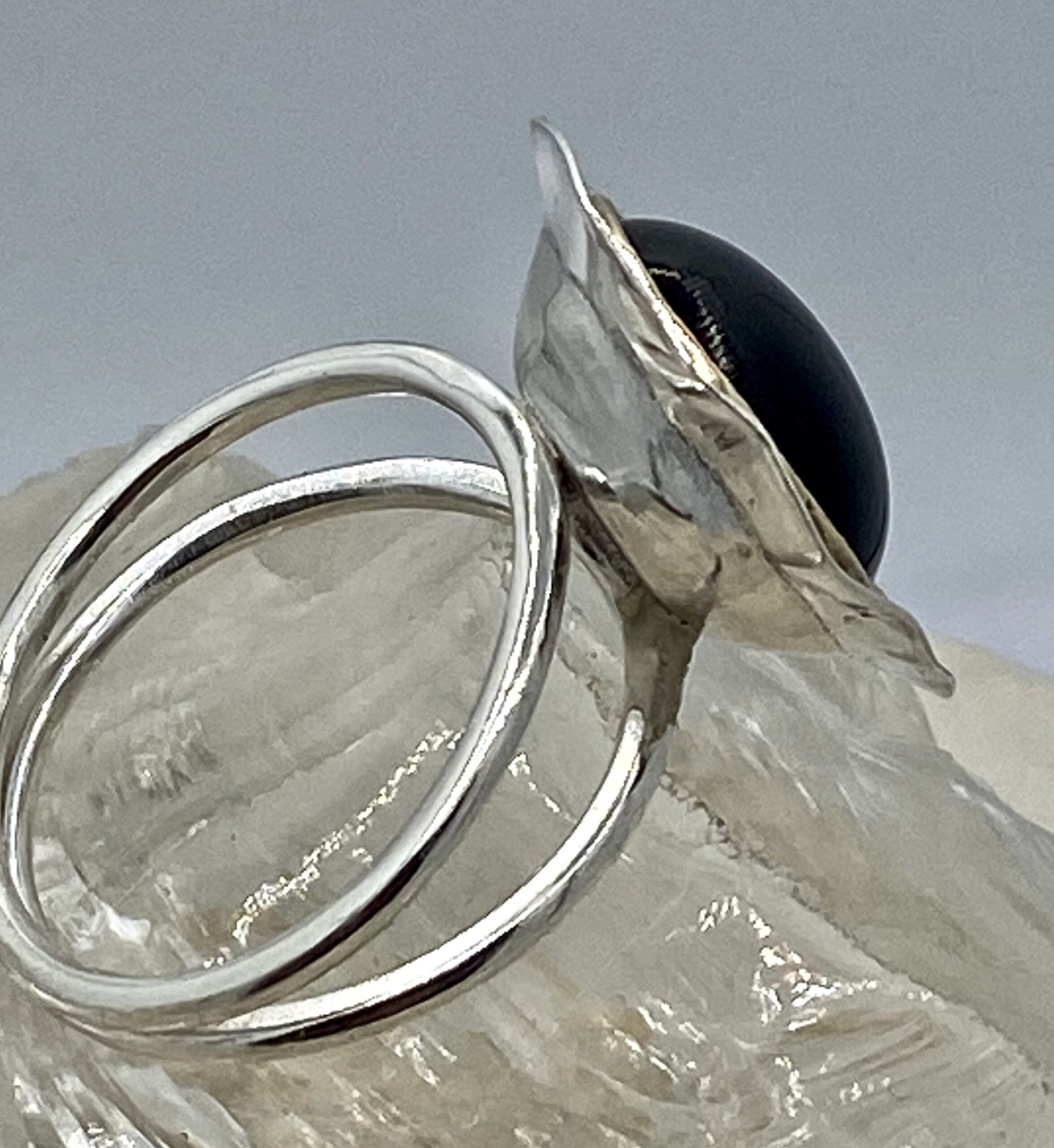 Damesring zilver gematteerd , gesmeden en gehamerd met bolletje van tombak