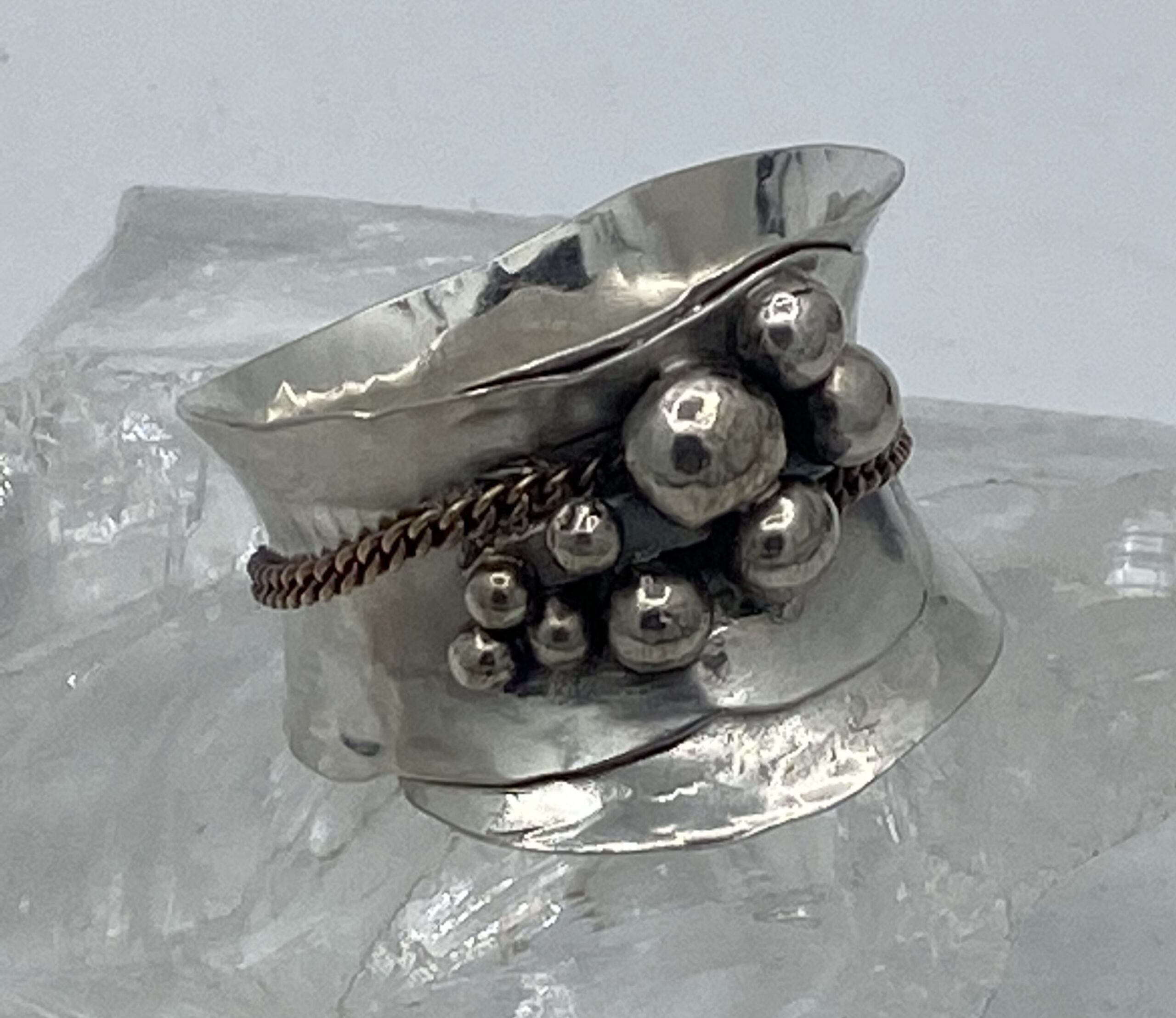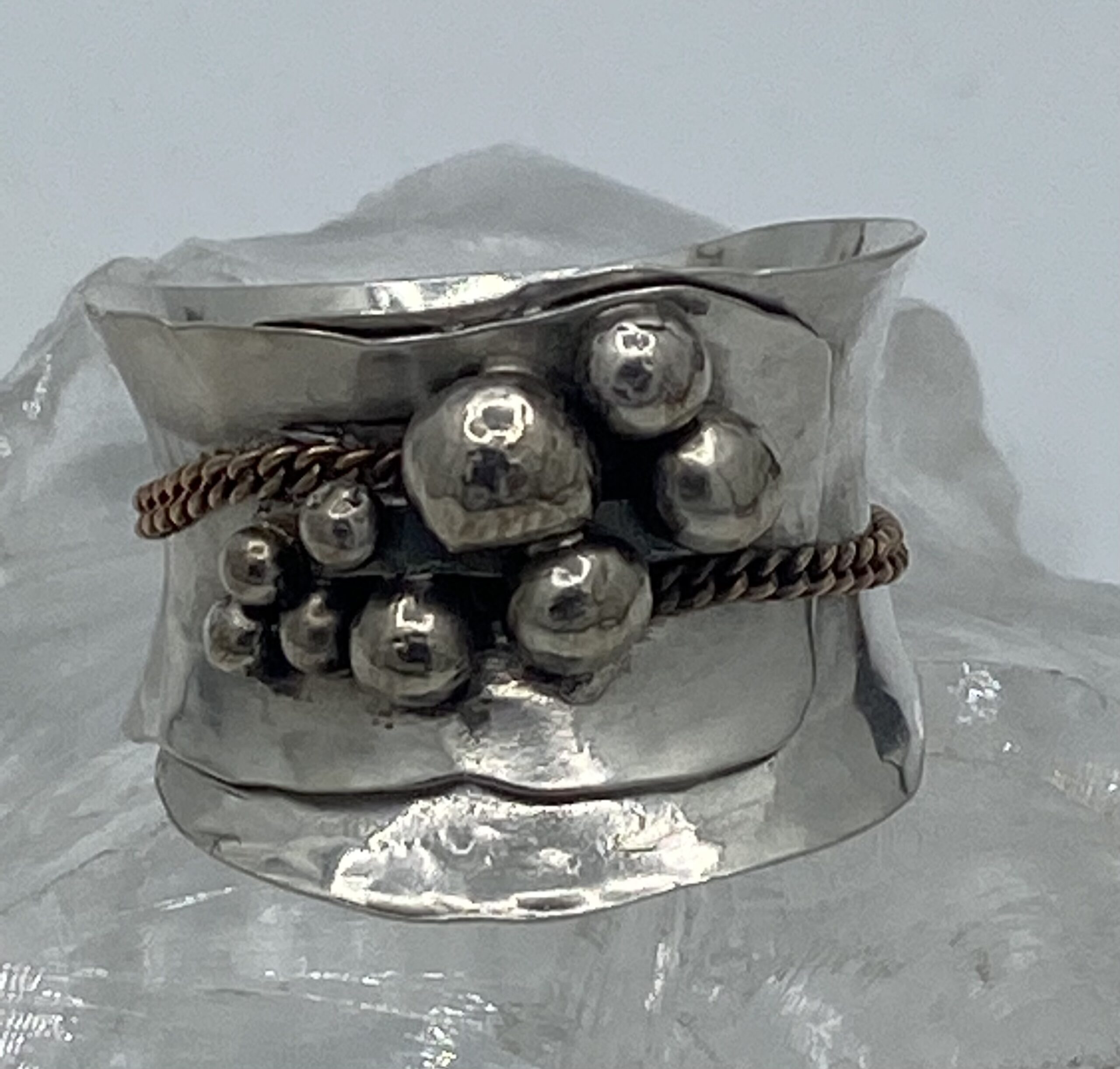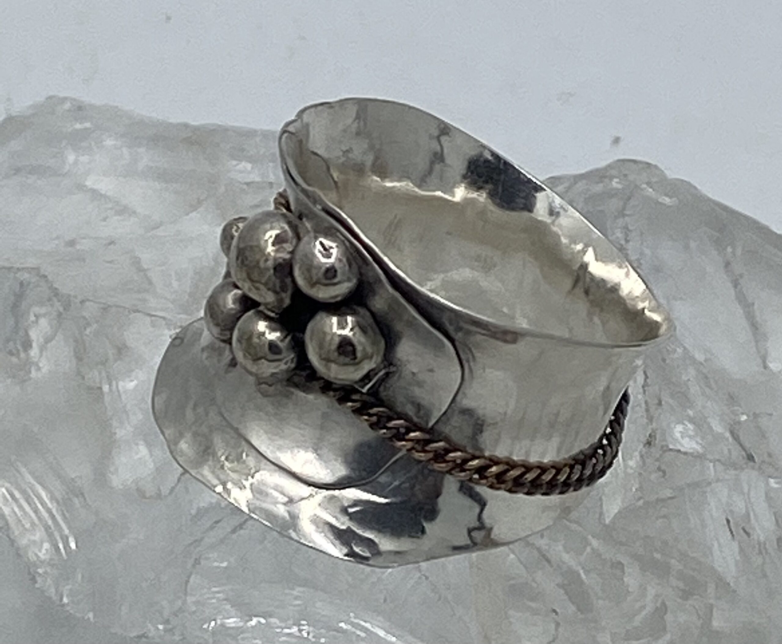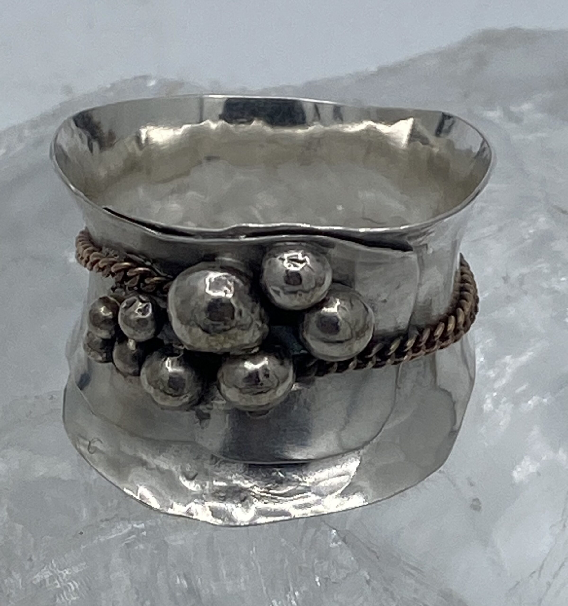 Zilveren ring gesmeden en gehamerd met zilveren bolletjes en ketting