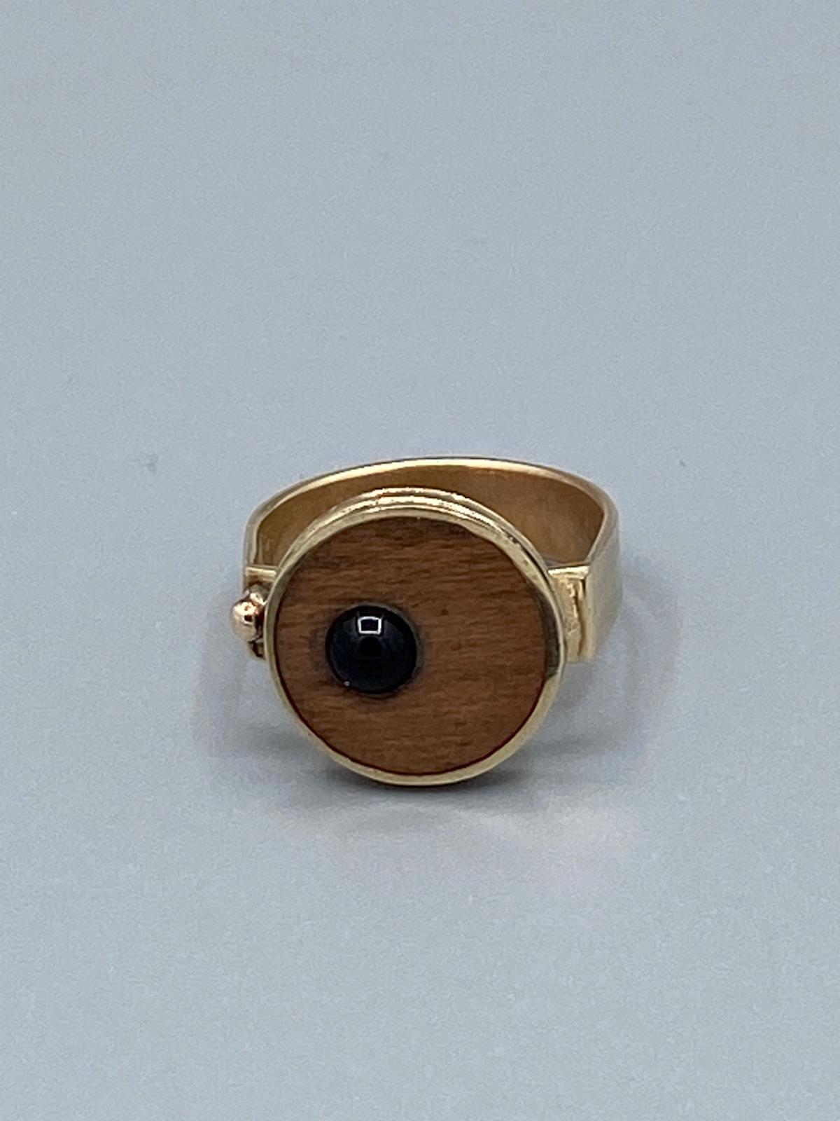 damesring van tombak en hout , inzetje glas