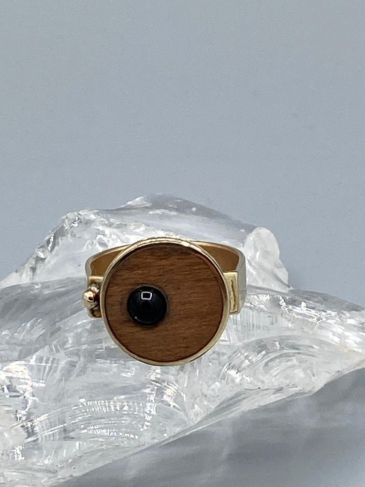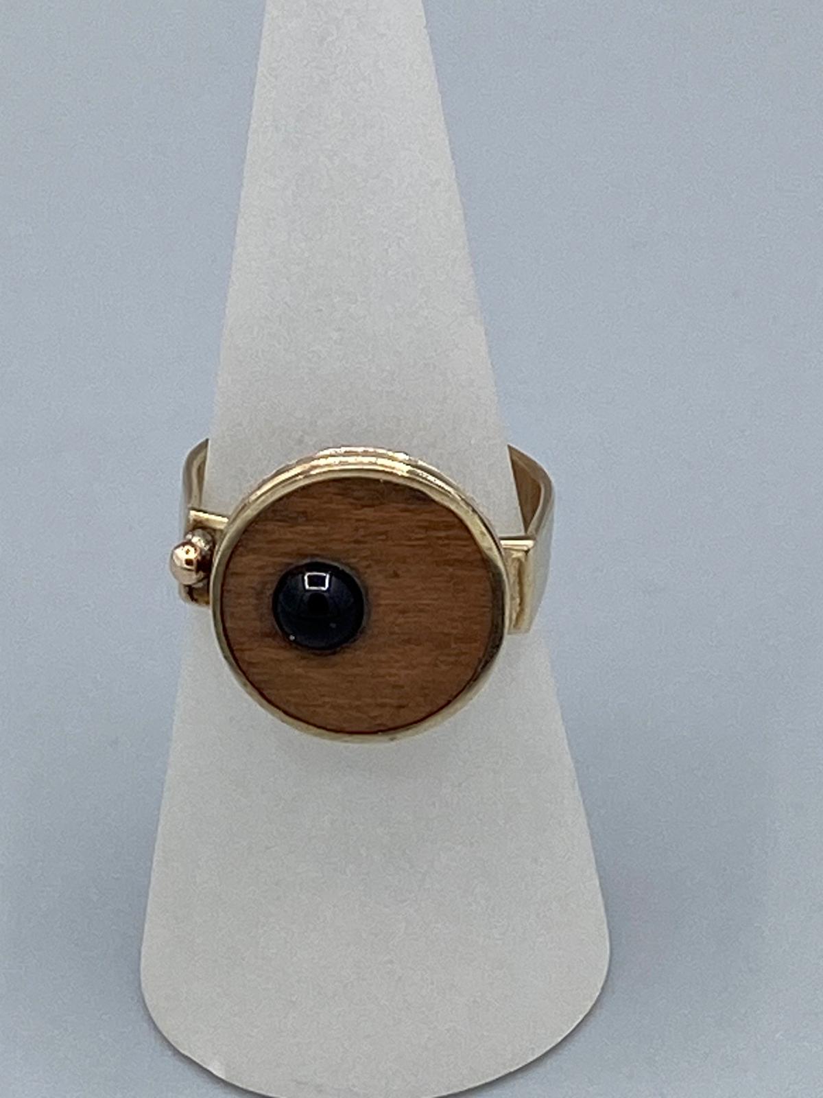 / damesring van tombak en hout , inzetje glas